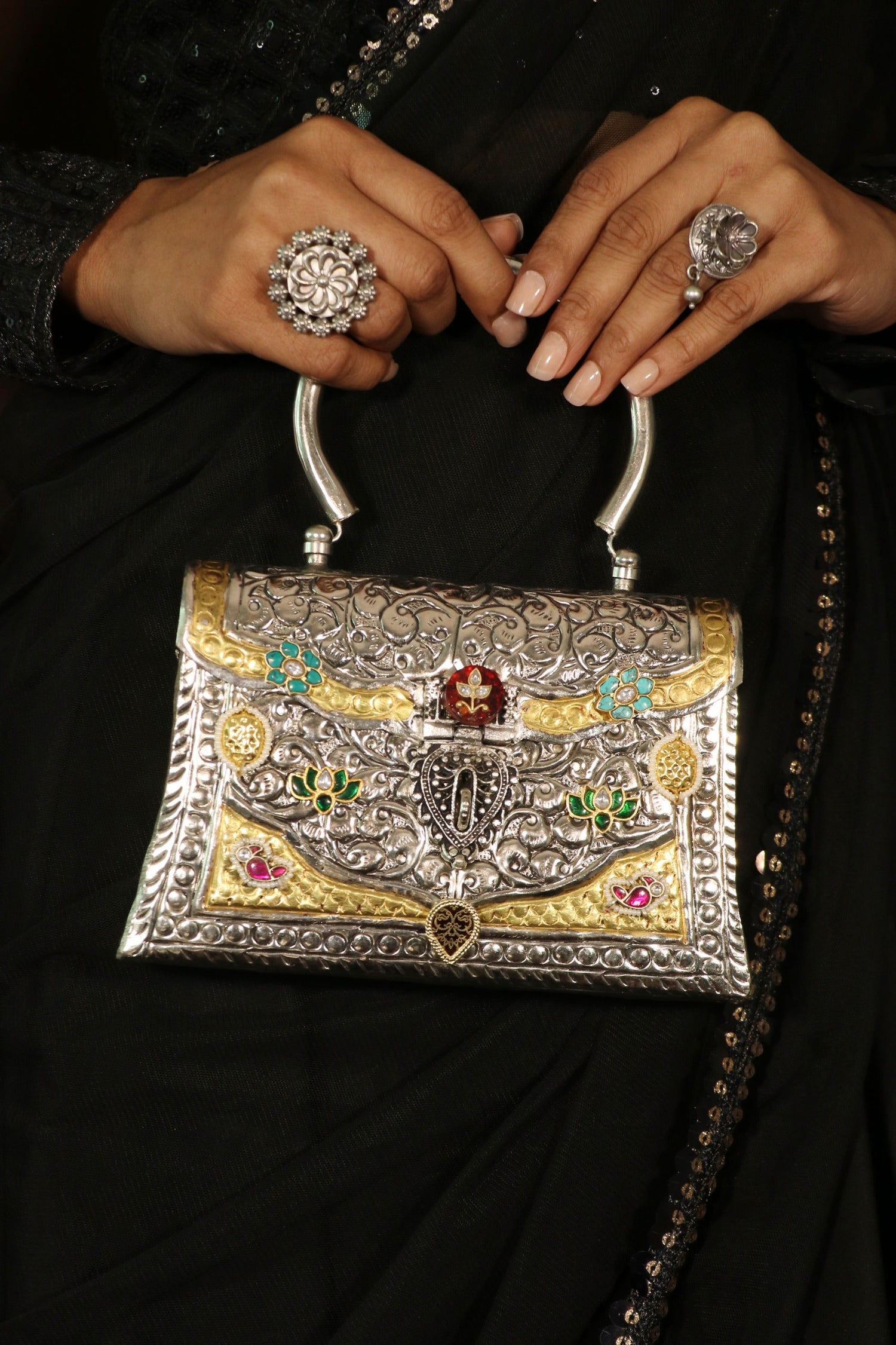 Discover the Chandini Collection from Theeya Jewels. These stunning, silver-look-alike bags are...