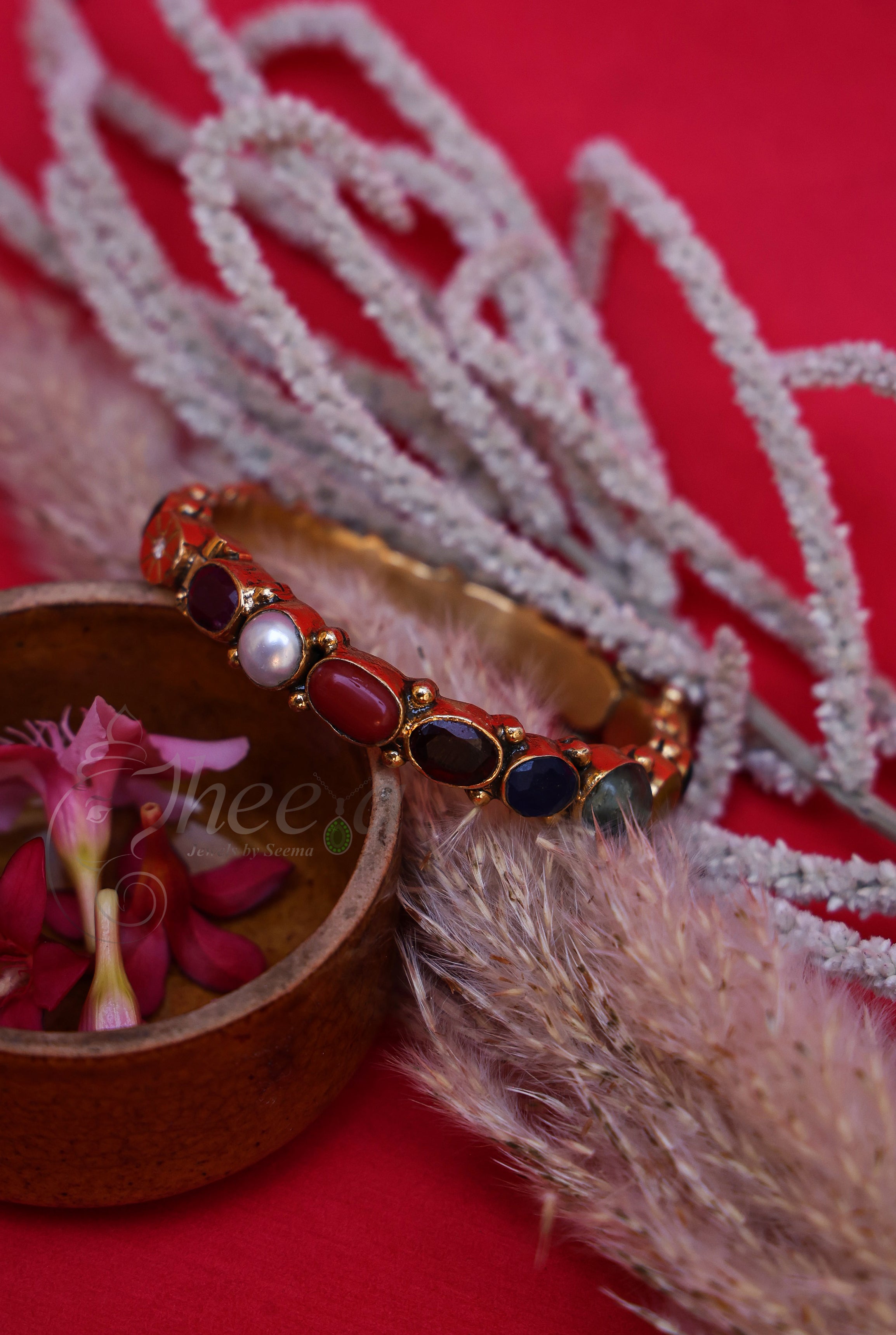 Elevate your style with Theeya Jewels' Red and Cream Meenakari Bangle. This handcrafted piece reflects timeless elegance and global sophistication. Suitable for all ages, it features...